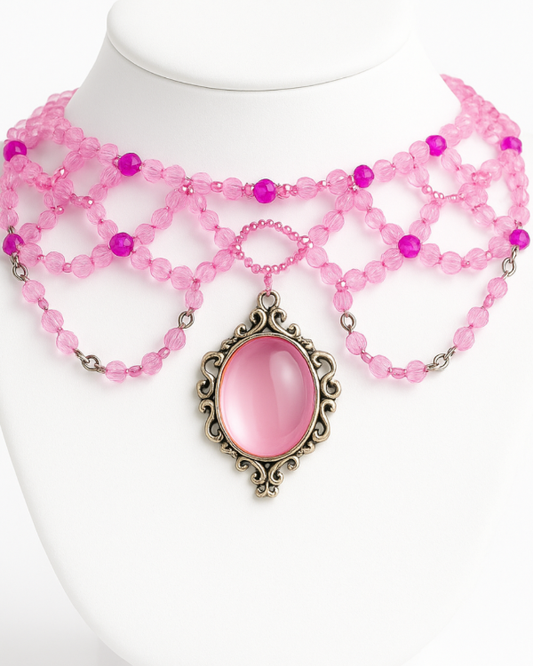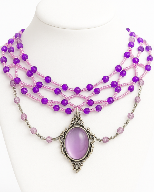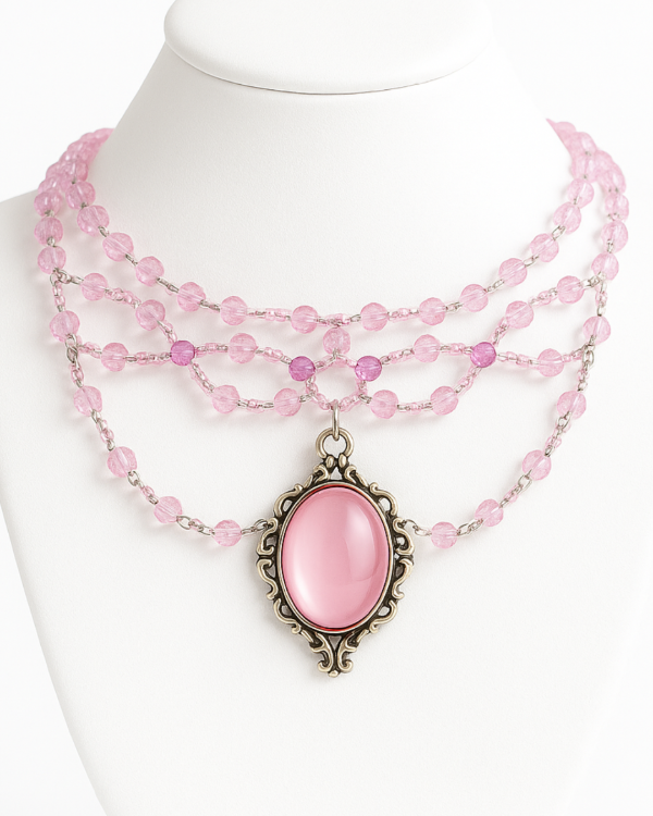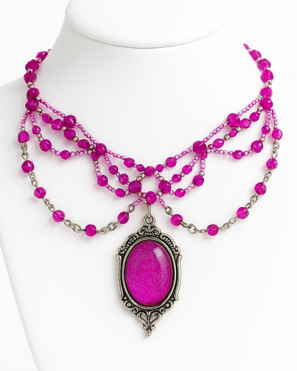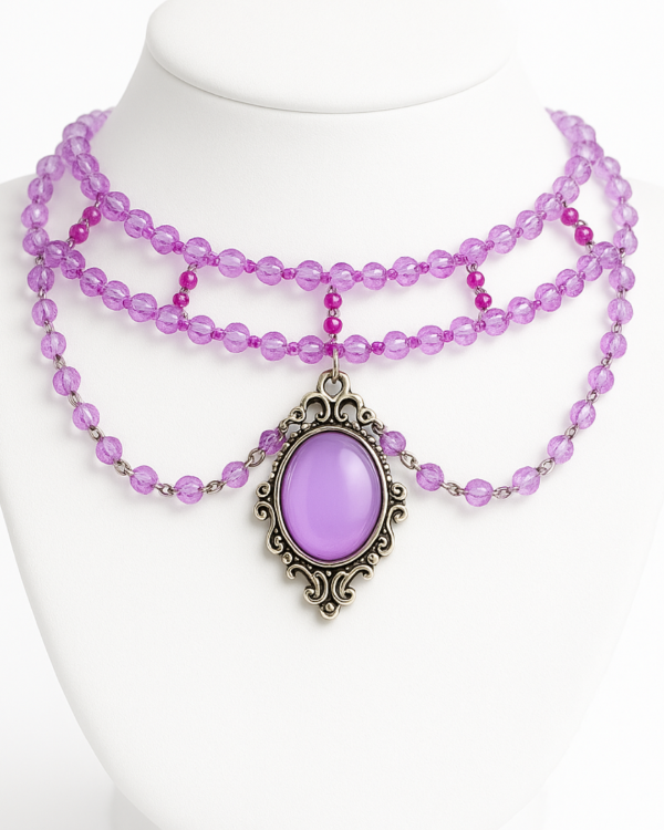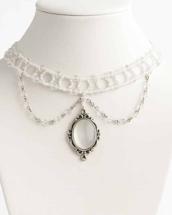 El diseño en capas y la caída envolvente recrean la estética romántica y dramática del período victoriano, mientras que los camafeos centrales evocan los retratos de amantes imposibles, damas melancólicas y hechiceras de otra era. El trabajo artesanal convierte a cada pieza en única, como si llevaras al cuello un relicario encantado.