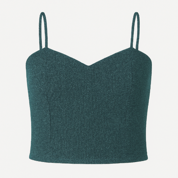 Confeccionado en lurex de acabado brillante, su textura suave y su diseño musculosa se adaptan al cuerpo como una segunda piel. El pequeño escote en V realza el busto con sutileza, creando una silueta natural y encantadora.
